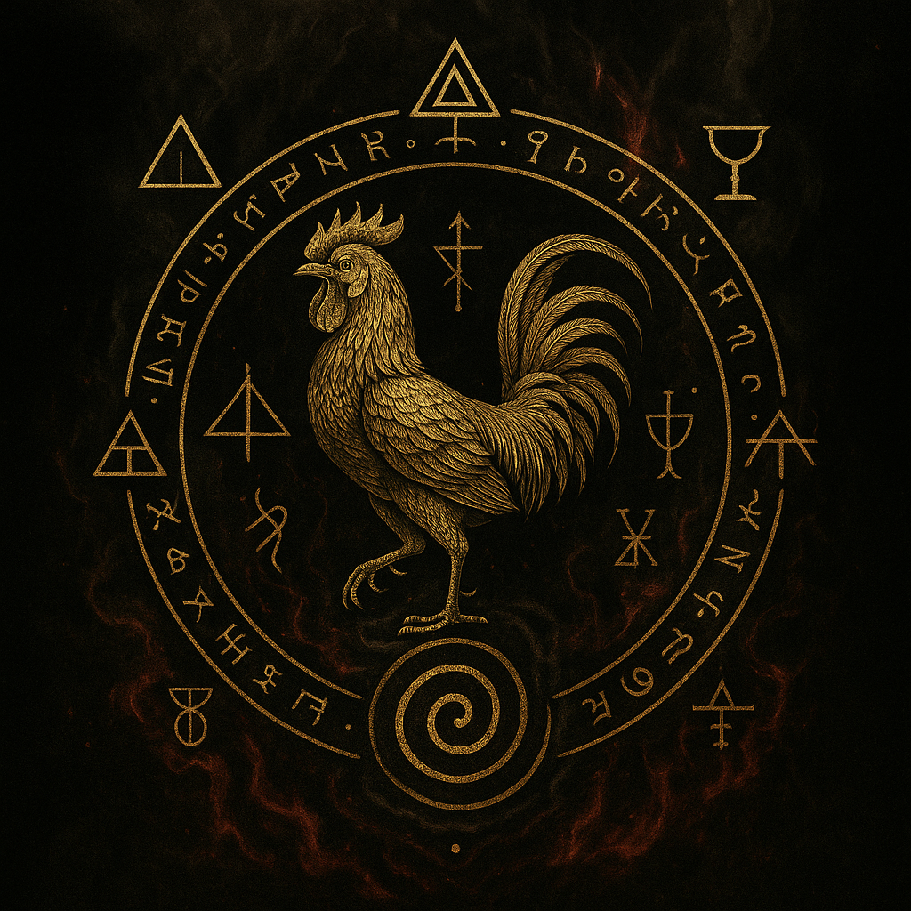 (What is burned is transformed.)Rooster feather or symbol – the guardian of new dawns.